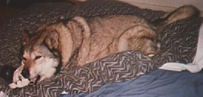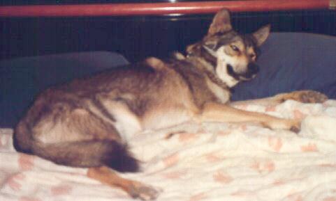 I got McQuaid from a breeder near Sacramento, he was a 4 month old a bundle of fear. He quickly warmed up to us, and began his reign of destruction. I realized this guy could and would chew anything that he could reach. Even to his last day he ate anything… rubber, plastic, wood, paper, you name it. I think this continuous life of passing indigestible things through his system is what caused his chronic illness which the Vet called "Inflammatory Bowel disease". It can usually be controlled with Flagyl and Prednisone, and usually bouts of it occured after he ate something really bad, like a plastic food bowl! However the last year the Vet put him on another drug to substitute the Prednisone called Leukeran… This is what actually killed him in the end. Beware do not give this stuff to your dog. What happened is that the side effect of this drug is to inhibit the production of the sticky blood cells that stop internal bleeding, towards the end his cell count dropped to zero and he effectively bled to death internally :-( Regular blood checks are necessary, the trouble is it seems that once this production stops it is irreversible. The drug did prevent the Bowl disease, but IMHO I think Prednisone was less destructive, although it has side effects too.